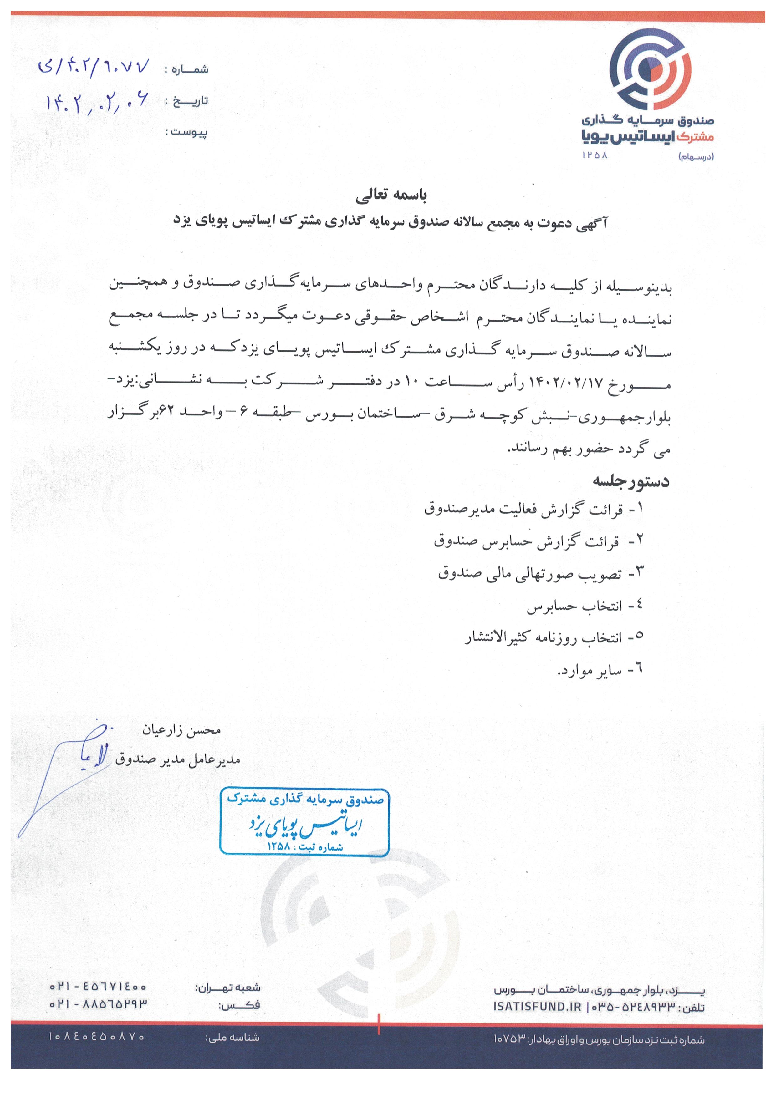 | مقدمه | آگهي دعوت به مجمع سالانه صندوق سرمايه گذاري مشترک ايساتيس پوياي يزد مورخ1402/02/17 |