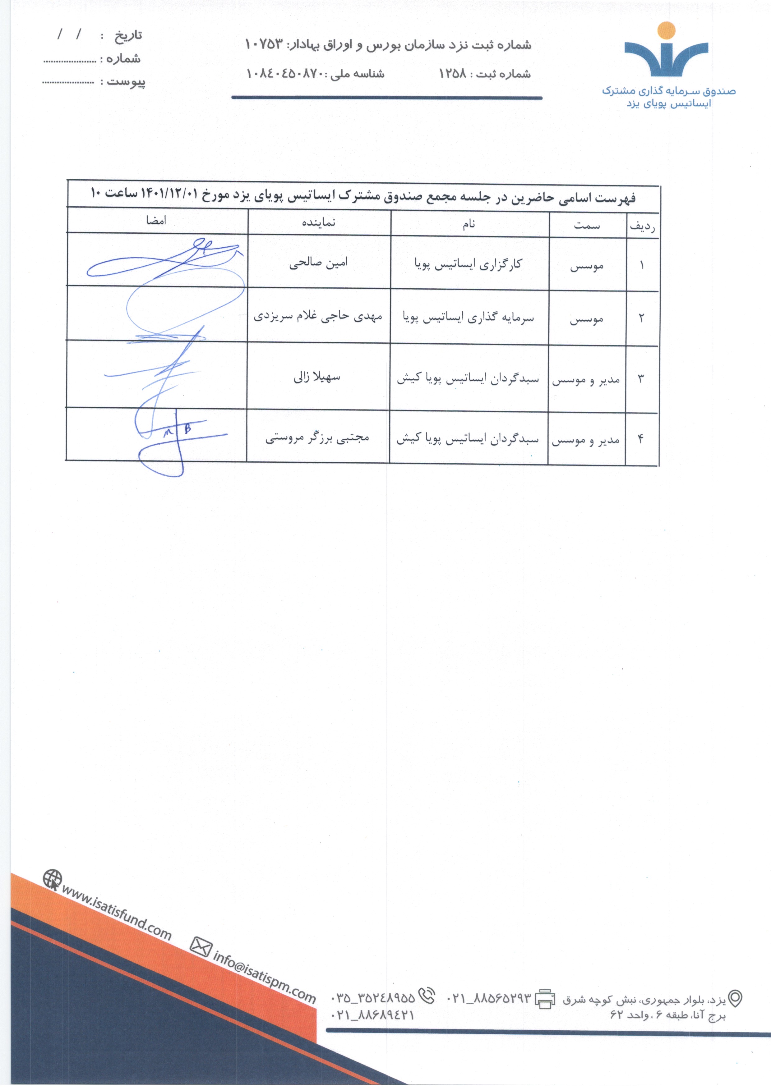 اسامی حاضرین در مجمع سالانه صندوق سرمایه گذاری مشترک ایساتیس پویای یزد مورخ1401/11/27