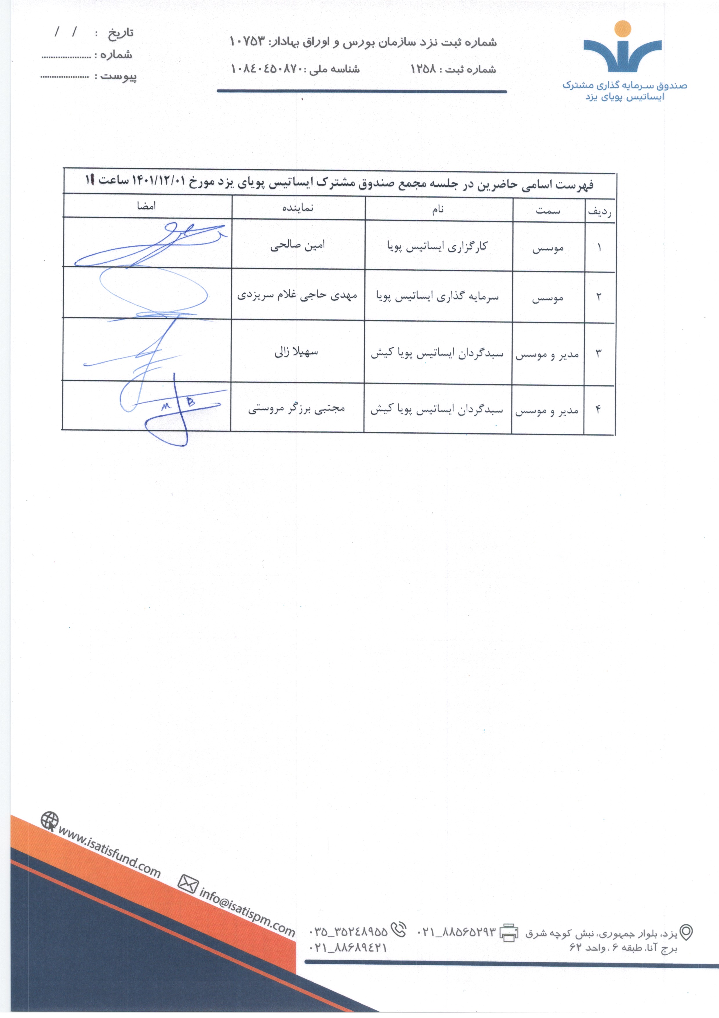 اسامی حاضرین در مجمع اساس نامه ای صندوق سرمایه گذاری مشترک ایساتیس پویای یزد مورخ1401/12/01